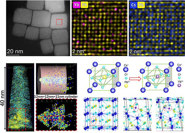 稀土掺杂卤化铅钙钛矿已在光电应用中展示出巨大的潜力。然而,长期以来,关于稀土离子(Ln3+)的存在与否一直存在争议。我校与东北大学科研团队合作,利用最先进的球差电镜和三维原子探针断层扫描(APT)技术,在原子尺度上直接识别了CsPbCl3钙钛矿中的掺杂的Yb3+。此外,通过APT技术,在近原子尺度上观测到CsPbCl3单晶的团簇现象,并结合密度泛函理论模型进一步证实并解释了相关机制。该研究结果在原子尺度上揭示了钙钛矿中稀土离子的掺杂机制,解决了长期以来钙钛矿中稀土离子存在形式的学术争议。