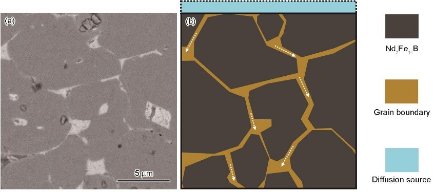 图3 烧结钕铁硼晶粒结构与晶界扩散示意图