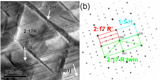 虽然当前稀土磁性材料的研究主要集中在钕铁硼型材料的研究中,但2:17型SmCo磁体的研究也一直是高温稳定性磁体的研究热点。中国科学院宁波材料研究所特别研究了钐钴永磁体的磁性能难以进一步突破的问题。因为在晶体晶界处存在一种胞状结构的缺失,它会导致磁体在外加磁场下率先发生反磁化,从而使磁体的磁性能难以进一步提升。而这种胞状结构的演变主要与磁体中Cu原子的定向偏聚有关,通过优化时效过程可以使胞状结构具有更强的磁畴钉扎能力,从而具有大幅提升磁体矫顽力的效果。西安交大前沿科学技术研究院借助原位同步辐射XRD、原子级分辨TEM和洛伦兹TEM等表征手段分析了2:17型SmCo磁体的析出相1:5H胞壁相并研究了其形成机制,如图2。研究人员发现调控固溶处理温度和优化时效工艺可以改善这种胞壁相从而提高磁体矫顽力,这有利于进一步调控2:17型钐钴相分解过程并获得高性能的钐钴高温永磁体。