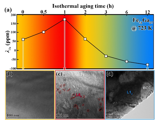 西安交通大学前沿院马天宇教授和任晓兵教授课题组在高灵敏无稀土磁致伸缩材料研究方面取得重要进展。他们基于大磁致伸缩Fe-Ga合金亚稳态和平衡态相结构差异显著的特性,通过简单的“固溶+时效”处理,在立方相基体中析出四方结构的纳米第二相颗粒,利用两相之间的磁弹相互作用,将多晶材料的磁致伸缩性能提高3倍,与单晶材料相当,同时大幅降低驱动场,使磁致伸缩灵敏度提高5倍,如图5所示。这为研制高灵敏无稀土磁致伸缩材料提供了新途径。北京航空航天大学材料学院通过强制固溶微量(0.2%)稀土元素与纳米相交互作用,引发A2基体晶格发生更大的四方畸变,获得了1800 ppm的磁致伸缩应变。包头稀土研究院磁性材料研究所相关人员通过实验分析,在Fe83Gd17合金中Co元素取代1.5的Gd,使磁致伸缩值由141 ppm增加至195 ppm,增加38%。此外,基于Fe-Gd合金单晶<100>取向的磁致伸缩系数明显高于其他方向,沈阳工业大学材料各向异性与织构教育部重点实验室利用二次结晶方法强化<100>取向,实现择优织构与纳米异质相对磁致伸缩性能的协同强化。结合淬火工艺调控纳米异质相数量,显著提高Fe-Gd合金薄带的磁致伸缩系数,有望推动高能量转换效率Fe-Gd合金器件的开发。