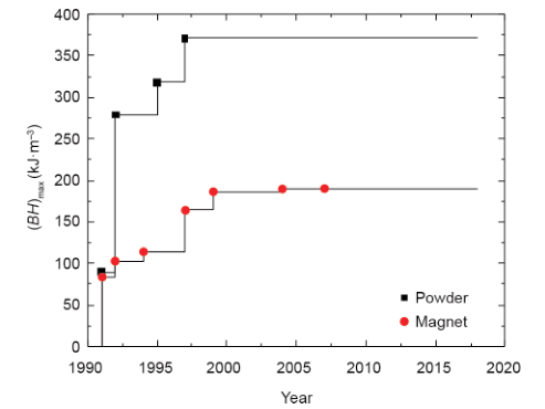 图4 近30年粘结磁体及其粉末的磁能积发展进程图