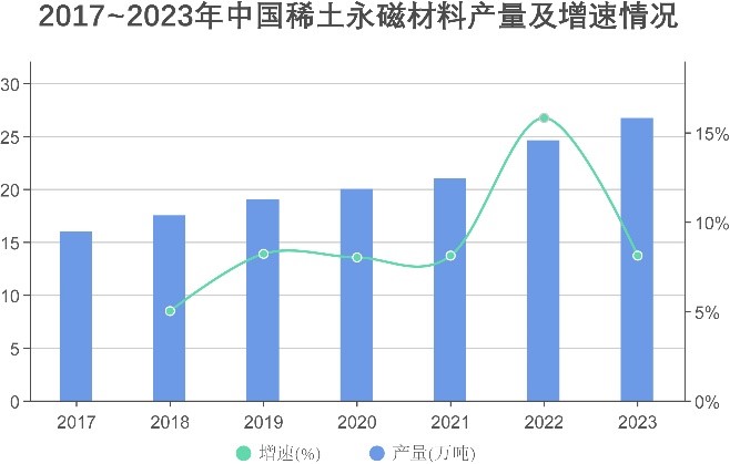图1 2017-2022年中国稀土永磁材料产量及增速情况示意图(2023年为预估)