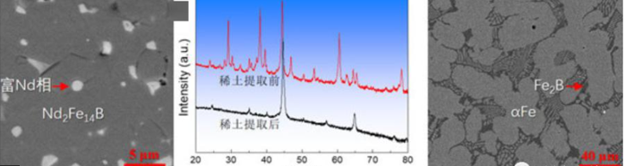 近年来,我国研发的稀土磁体在磁性能上已经可以与日本的产品相媲美,但在磁体耐候性上还有一定差距。图6为NdFeB磁体腐蚀前后的磁场分布对比图。可以看出,磁体腐蚀导致磁场分布发生明显变化,磁体腐蚀不仅削弱了磁场,还打破了其固有的磁场均匀分布规律。所以,磁体表面防护具有十分重要的意义。此外,航天和交通运输方面对磁体表面防护提出了更高要求。传统磁体表面防护技术已经不能用于高端制造领域在磁体耐蚀性能、力学性能和环保要求等方面的应用。当前国内多所科研院所也都在开展相关的研究,钢铁研究总院和合肥工业大学采用阴极电泳、真空蒸镀等环境友好型涂镀方式在磁体表面制备新型防护层上都取得了较好的成果,通过系统研究涂层制备工艺、结构与性能之间的关系,为发展高性能稀土磁铁机器表面防护技术提供了实验支撑。回收废钕铁硼是化解关键稀土元素供给危机和保持我国稀土资源全球优势的有效办法。钕铁硼废旧料主要来源于材料制备过程中产生的废料(废品量约为30%),以及因更新而被淘汰的废旧产品。钕铁硼中Nd2Fe14B为主相,稀土与过渡金属原子间形成较强的键能。钕铁硼中还含有改善其综合性能的镨、镝、铽、钴、铝、铜等其它元素,此外,在钕铁硼产品表面还有电镀金属层。因此,提取钕铁硼废旧料中的稀土具有难度,尤其如何实现稀土与其它金属的绿色高效分离以及高质化再利用是关键。近年来,中国科学院金属研究所材料特种制备与加工研究部领衔开展了钕铁硼废旧料回收新技术研究。基于金属原子间的相互作用,研制了一系列用于选择性自发溶出钕铁硼中稀土元素的捕集剂,揭示了稀土元素在钕铁硼/捕集剂界面间的扩散行为及其控制方法,提出了钕铁硼“稀土无酸自组装溶出”新方法,建立了钕铁硼循环再利用技术路线,回收获得了各种稀土氧化物产品和铁硼合金,总提取率大于97%。钕铁硼中稀土被提取后,残余物为铁硼合金(由铁、硼、钴、铜和铝等元素组成,其中铁含量约95%、氧含量低于20 ppm。图7是稀土元素被提取前和后NdFeB的SEM显微组织结和它们对应的XRD物相分析对比图。中国科学院在这方面投入了较多精力,如赣江创新研究院探究了不同扩散介质对CaH2-还原扩散法回收钕铁硼由泥废料的影响。通过热力学计算、相结构和微结构分析,发现以KCl为扩散介质制备的钕铁硼粉末粒度更细、杂质含量低且粒度分布均匀。最后,再通过添加40 wt%的Nd2Fe14B合金粉末,成功制备出了性能为Hcj = 16.5 kOe、Br = 11.7 kG和(BH)max = 31.8 MGOe的再生钕铁硼烧结磁体。内蒙古大学化学院试验了直接回用法、火法冶金、湿法冶金等多种不同NdFeB废料回收技术的工作原理和研究进展,分析了各自的优劣势,并提出了未来NdFeB废料绿色、高效、可持续回收技术的重点研究方向,为稀土二次资源的高效开发利用研究提供有益参考价值。
